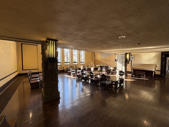 食堂には東西に大きな窓ガラスがあり、その外にはテラスがありました。しかし、学生が増えたことで食堂が手狭となり、1923年頃、弟子の遠藤新がバルコニーだった場所を小部屋としました。ただ、師匠が手がけたものに手を加えることに二の足を踏み、大きな窓ガラスは、食堂内の他の窓ガラスに使いました。