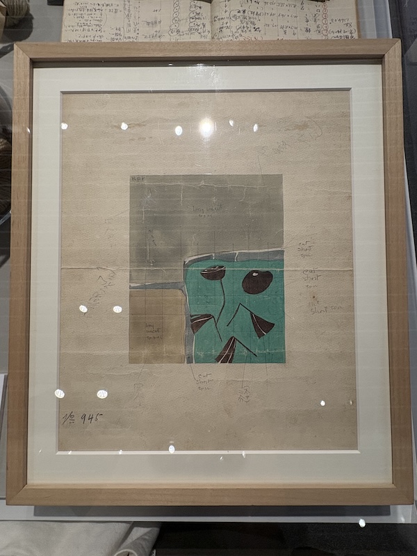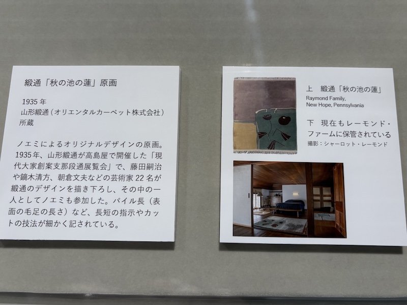会場には、ノエミがデザインした緞通の原画、色調結束サンプル、山形緞通(オリエンタルカーペット株式会社)に残るノエミが発注した作品の記録ノートも展示されています。